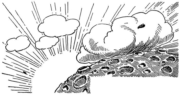The Moon, seen from where the children viewed it, was of a pale bluish-greenish tint, except where the rays of the Sun slanted across the mountain peaks and into the deep valleys. It seemed to Johnny and Janey as though they were looking through beautiful blue-green glass down into a dark well; for wherever the Sun did not shine or was not reflected from the mountains into the valleys the Moon’s surface was black—so black that it made the rest of the Moon seem transparent. This seemed to the children very strange.