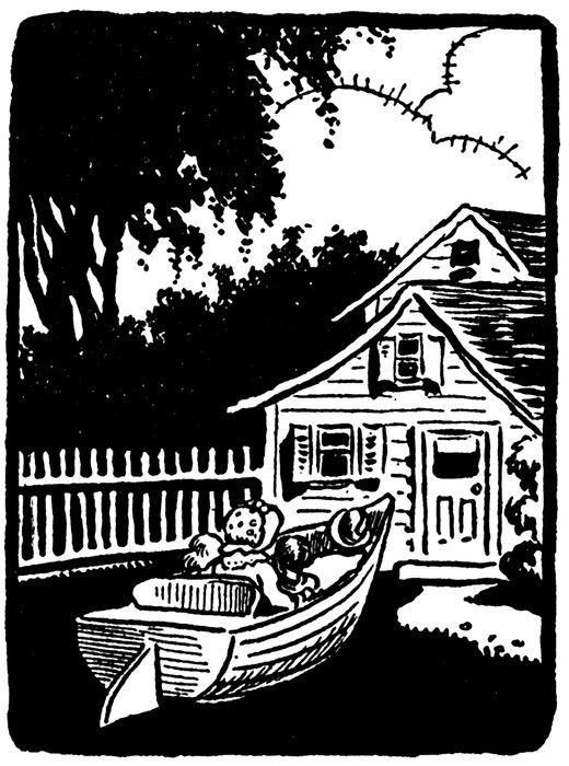 “Yes, it needs a sail and a mast and a rudder,” replied Johnny. “Run in and ask Gran’ma for an old sheet to make the sail of, will you, Janey? I’ll be putting on a mast and the rudder.”