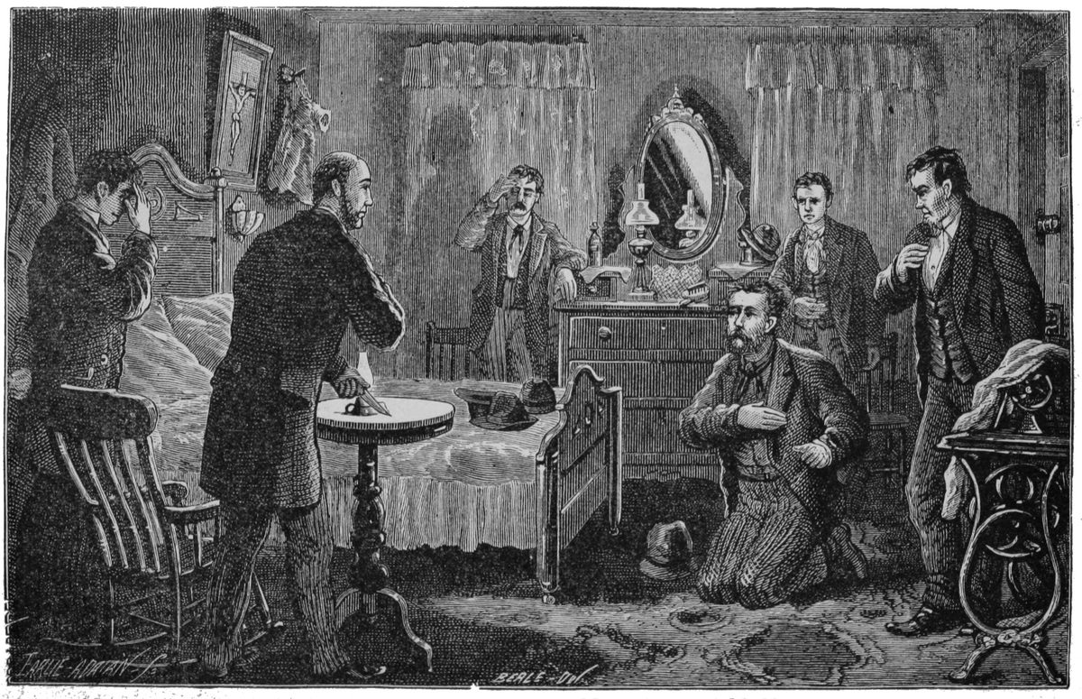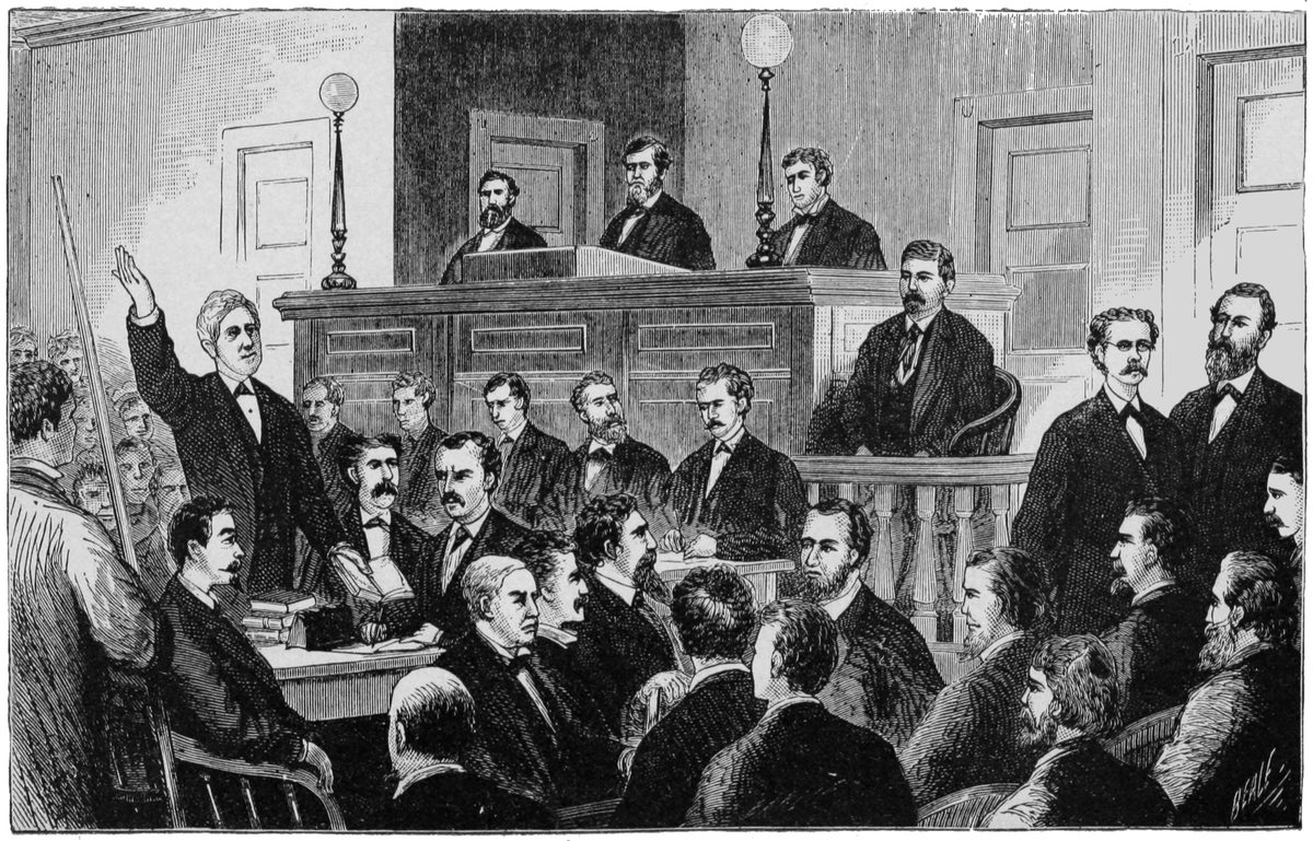 John Kehoe, Michael O’Brien, Chris Donnelly, John Donahue, alias “Yellow Jack,” James Roarty, Dennis F. Canning, Frank McHugh, John Gibbons, and John Morris were arrested on the sixth of May, 1876, charged with conspiracy, at the famous Mahanoy City Convention of the first of June, 1875, to kill Wm. M. Thomas and Jesse Major. They were tried at Pottsville before President Judge Pershing and Associates Green and Walker, commencing August 9 and ending August 14, 1876. The trial for conspiracy attracted 542the gentleman of the bar from all parts of the State, and during its continuance the court-room was daily crowded to the point of suffocation with ladies and gentlemen, some of them having traveled hundreds of miles to have a view of the Mollies, the jury, the court and officials, and the witnesses for the prosecution. McParlan’s testimony was intensely interesting, and such a public call for its particulars was there among the legal fraternity and the general reading public, that the entire evidence of the trial was printed in a pamphlet of nearly three hundred pages, and a very large edition quickly exhausted. The newspapers had special correspondents on the ground, and the illustrated journals of New York sent their artists to Pottsville to make drawings of the court and surroundings. The leading facts contained in this extraordinary suit have been given in the course of the preceding narrative. With the exception of the young man, Frank McHugh, who gave evidence for the Commonwealth, the defendants were all found guilty according to the counts in the several indictments, and sentenced to seven years’ confinement each in the penitentiary. McHugh has not been sentenced, having been recommended to the mercy of the court by the jury.