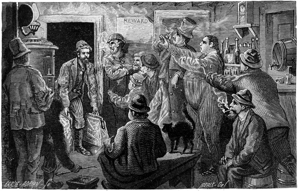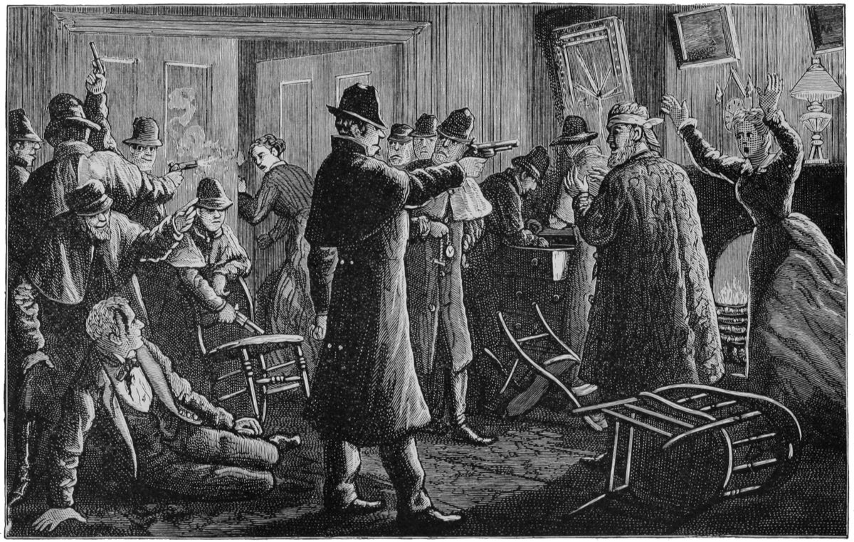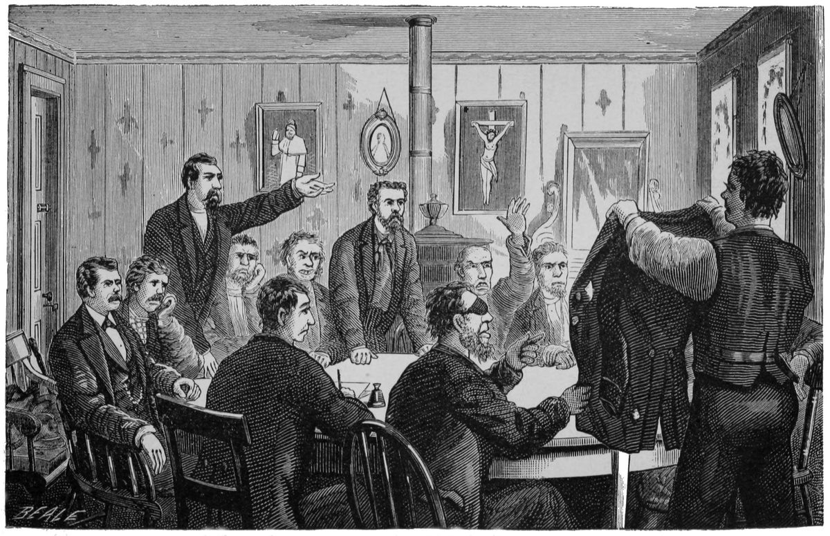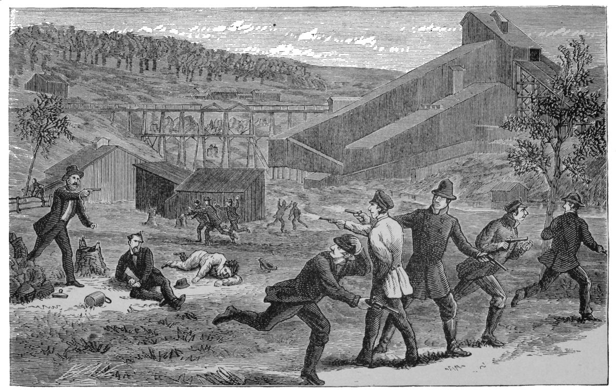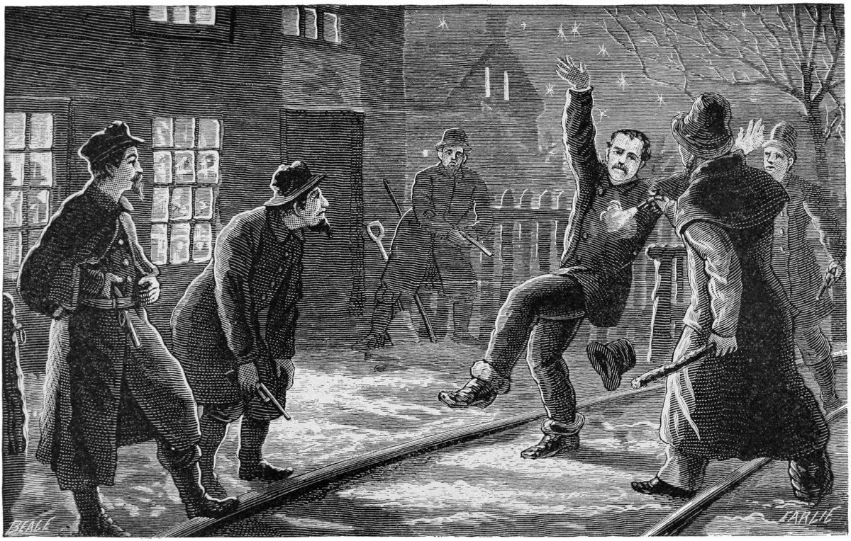 “At about a quarter to ten this morning, February 12, 1877, the stage from Rupert Station rattled up the street, into town, and disgorged its occupants in front of the Exchange 545Hotel. With Messrs. Hughes and Ryon, from Pottsville, the redoubtable Muff Lawler made his appearance. The meeting between Lawler and his old friend McParlan—Muff once knew him as McKenna, and initiated him into Shenandoah Division of the Mollies, a few years ago—was particularly interesting. Stretching out his hand, McParlan inquired of Lawler, as he indulged in a warm shake: ‘Have you the “goods” for the last quarter?’