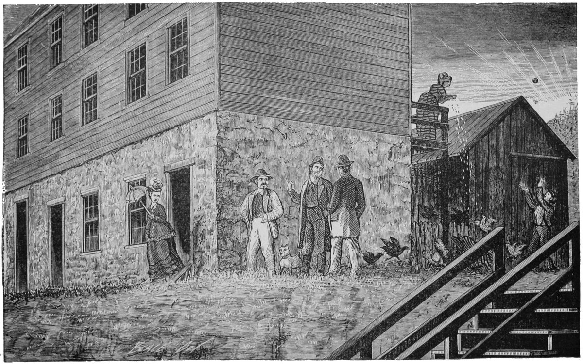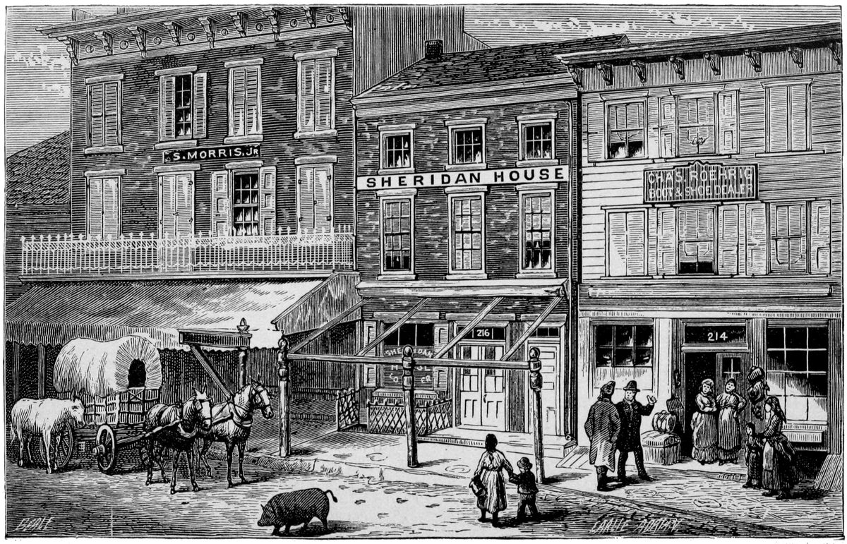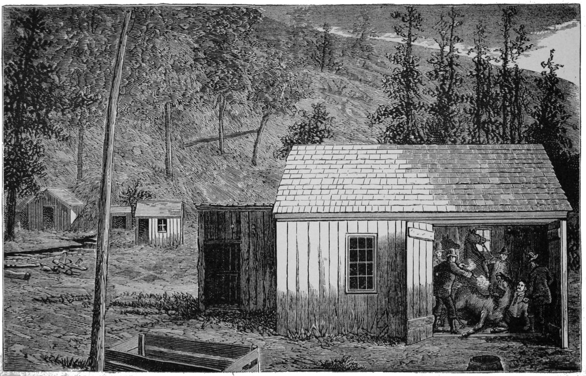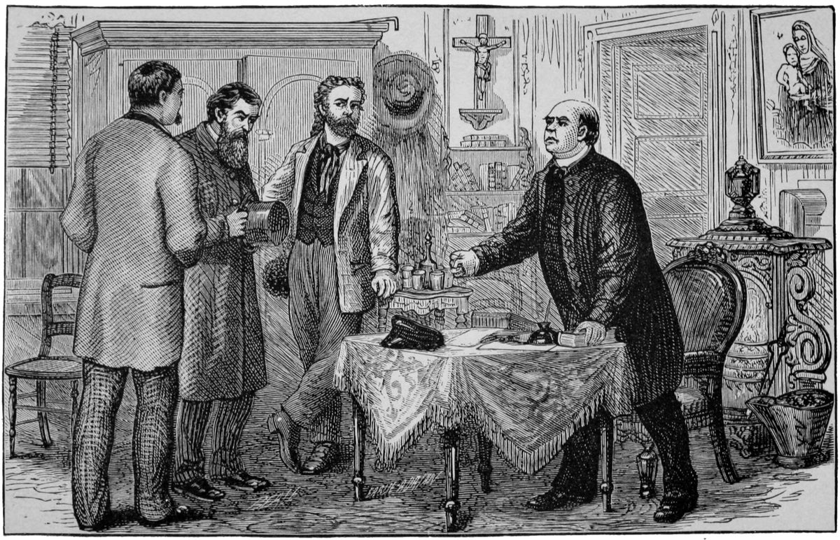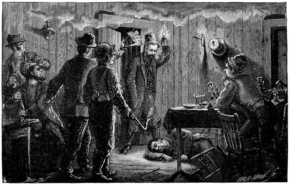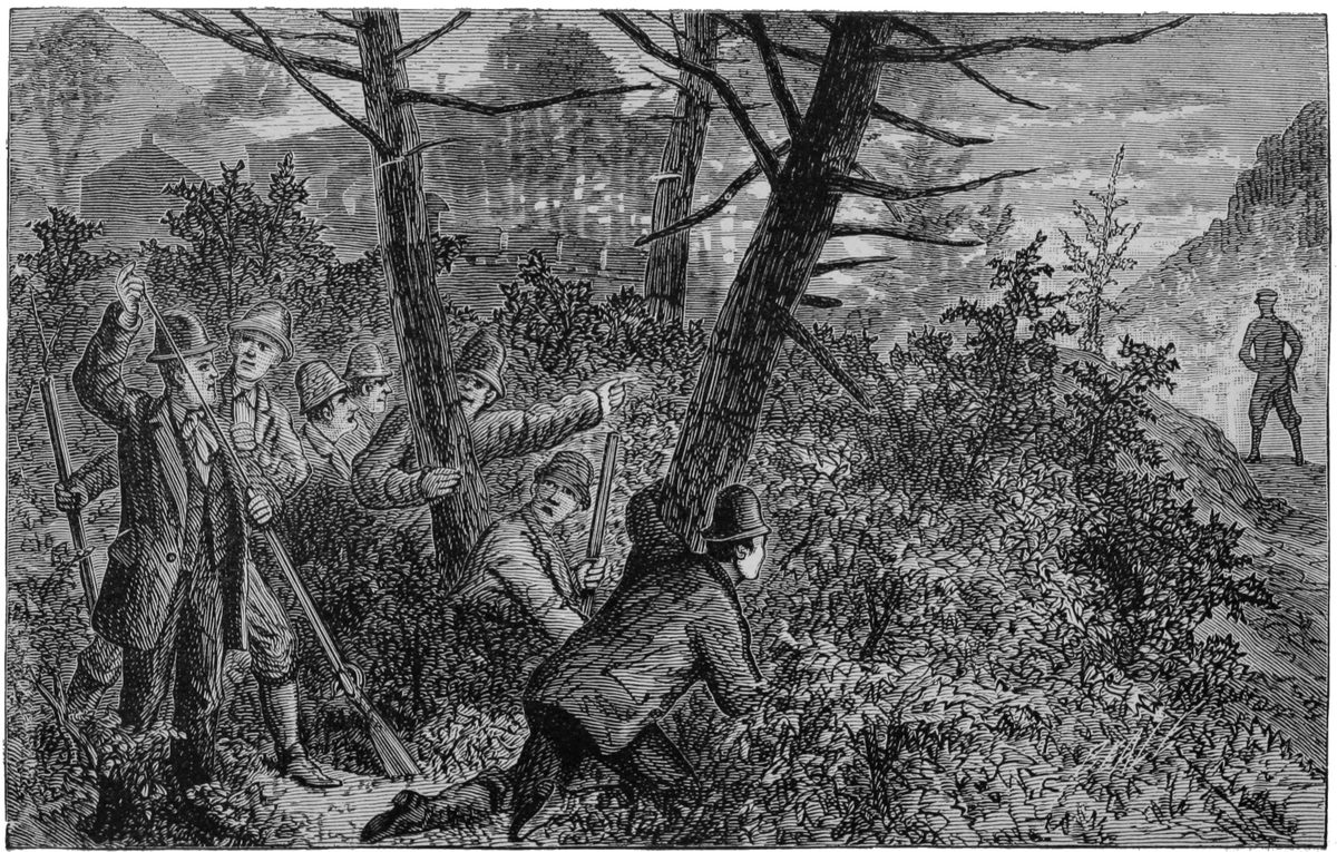 “At about a quarter to ten this morning, February 12, 1877, the stage from Rupert Station rattled up the street, into town, and disgorged its occupants in front of the Exchange 545Hotel. With Messrs. Hughes and Ryon, from Pottsville, the redoubtable Muff Lawler made his appearance. The meeting between Lawler and his old friend McParlan—Muff once knew him as McKenna, and initiated him into Shenandoah Division of the Mollies, a few years ago—was particularly interesting. Stretching out his hand, McParlan inquired of Lawler, as he indulged in a warm shake: ‘Have you the “goods” for the last quarter?’