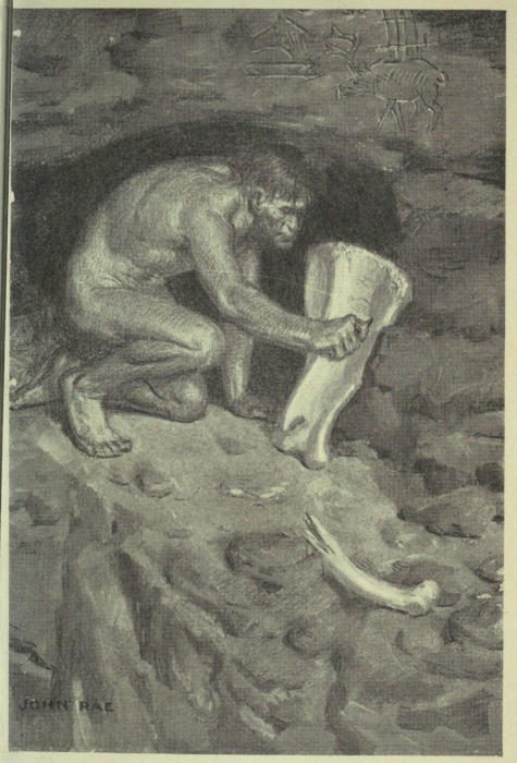 This No Man was so called, because he would neither hunt, fish, make weapons, nets, or marry. Therefore he was No Man. He lived on charity, and scratched pictures on bone. That was the only thing that interested him. He was suffered to live only because he was mysterious and because the tribe liked to[13] go to his cave and look at the pictures when there was nothing better to do.