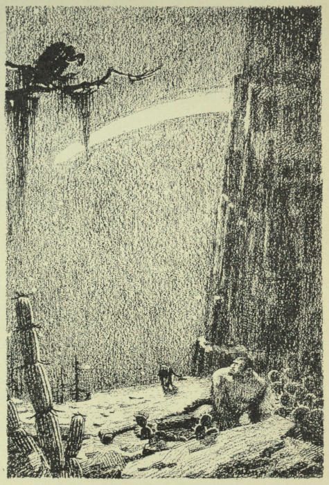 But she staggered to her feet and went on. And now she was crossing an arid plain, but upon the other side were the fires of a strange[254] tribe, and in the mouths of all the caves meat was hanging.