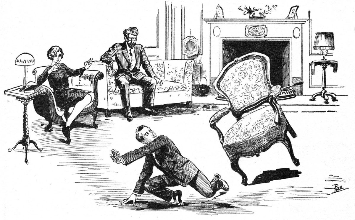 From where I stood I could see Miss Van Loan and the pseudo Dr. Dorp seated just as I had left them, while Rafferty, who was impersonating me, was staging a quite lively wrestling match in the center of the room with the chair which had proven so hostile toward me earlier in the evening.