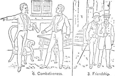 For instance, Combativeness is represented by a scene in a lawyer’s office, where a disagreement has led to an angry dispute; Secretiveness is shown by a picture of the cunning fox attempting to visit a hen-roost by the light of the moon; the teller’s desk in a bank represents Acquisitiveness; a butcher’s shop is made to stand for Destructiveness; the familiar scene of the “Good Samaritan” exhibits the influence of Benevolence; Sublimity is pictured by a sketch of the grand scenery of the Yosemite Valley.