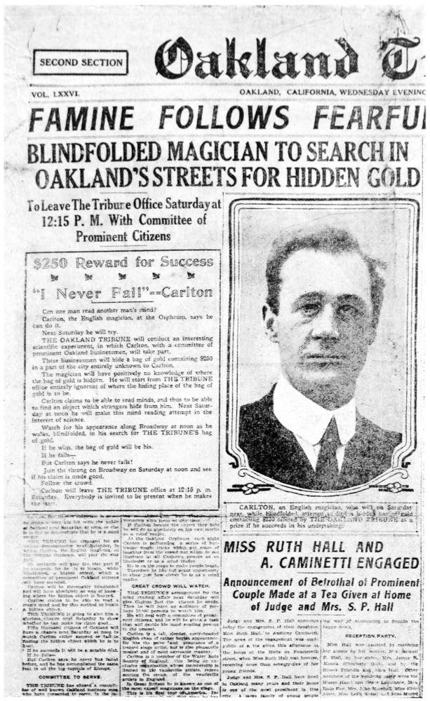 | How the great spoof first came into my mind—Hoaxing the newspaper Press of two continents—Telepathy and thought-transference—The incredulous reporter—I propose a drastic test—A representative of the Bristol Times and Mirror hides a stylograph pen in an unknown quarter of the city—I am blindfolded and find it—Amazement and enthusiasm of the people—A column report in the newspaper—An insoluble problem—Various theories as to how it was done—An indoors test imposed by the Editor of the Bath Chronicle—Blindfolded through the streets of Bath—Vast crowds—I am again successful—Press and public alike bewildered—Hoaxing the Yankees—The Oakland, California, Tribune’s test—Two hundred and fifty dollars in gold hidden—The Secretary of the Oakland Chamber of Commerce is chosen to secrete the treasure—Again I am successful—My best free Press “ad.”—Congratulations all round | 203 |